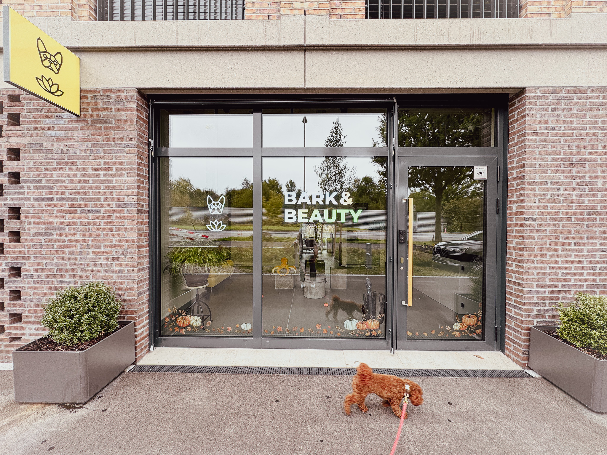 Front entrance of Bark & Beauty Grooming Wellness Studio in Zurich, Adliswil, Switzerland — modern, welcoming, and dog-friendly.