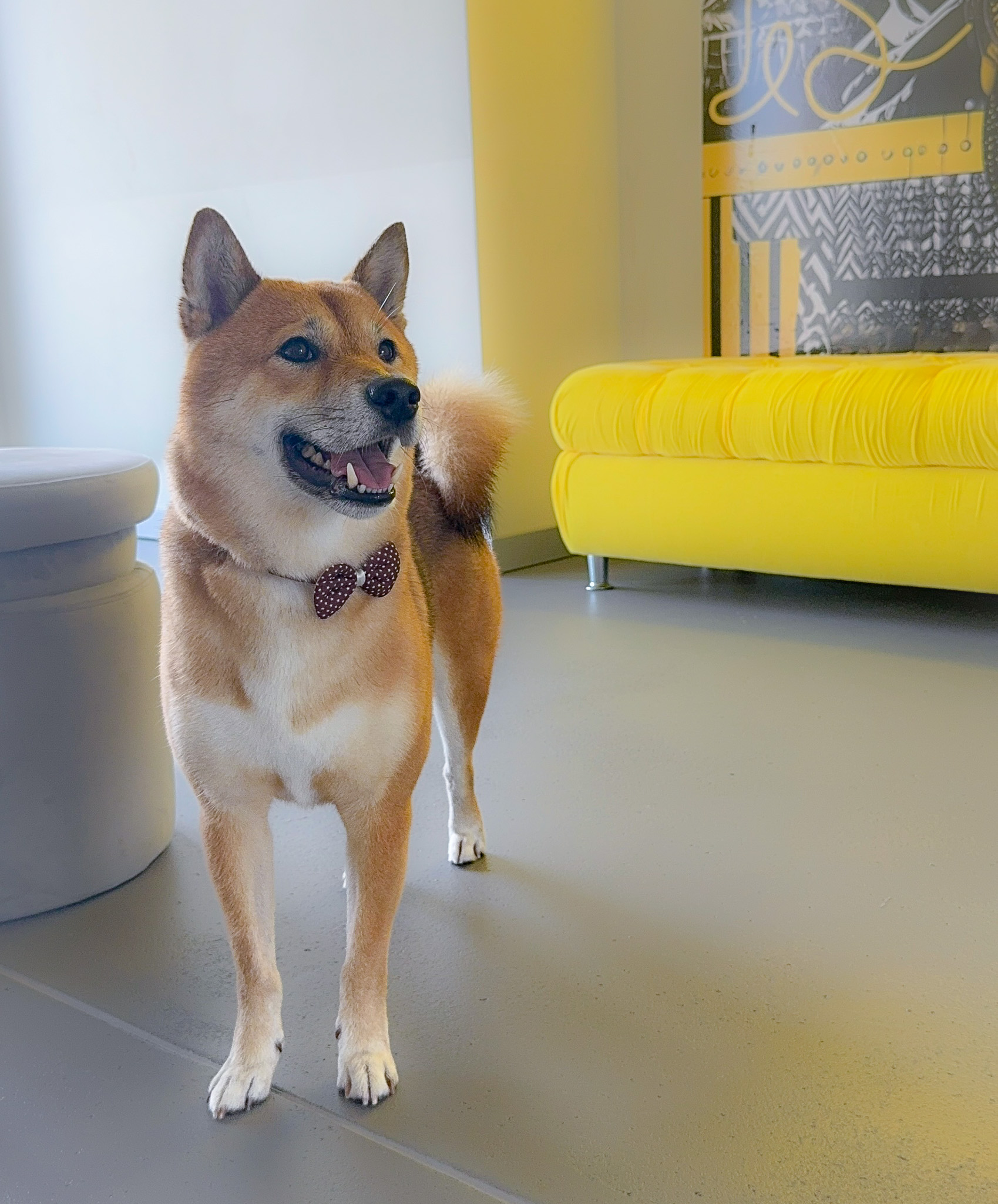 A stylish Shiba Inu poses after grooming at Bark & Beauty Grooming Wellness Studio — clean, confident, and ready to shine.