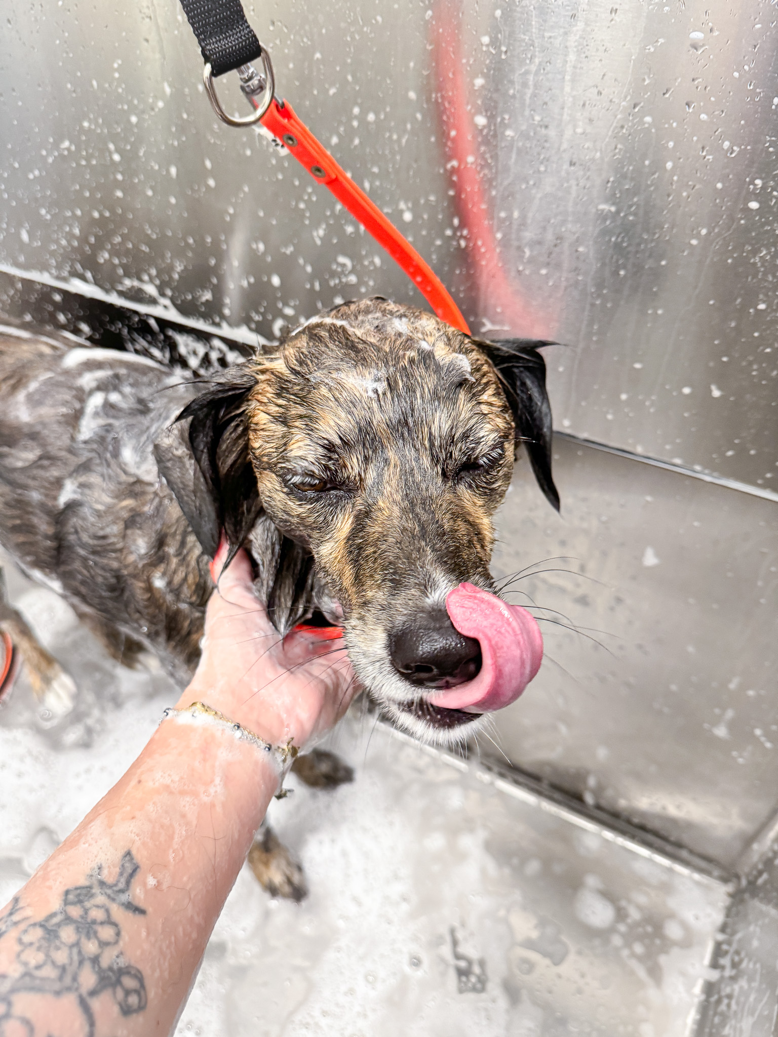 A cheerful pup enjoying the bubbly part of the grooming process — clean, refreshed, and ready for drying.