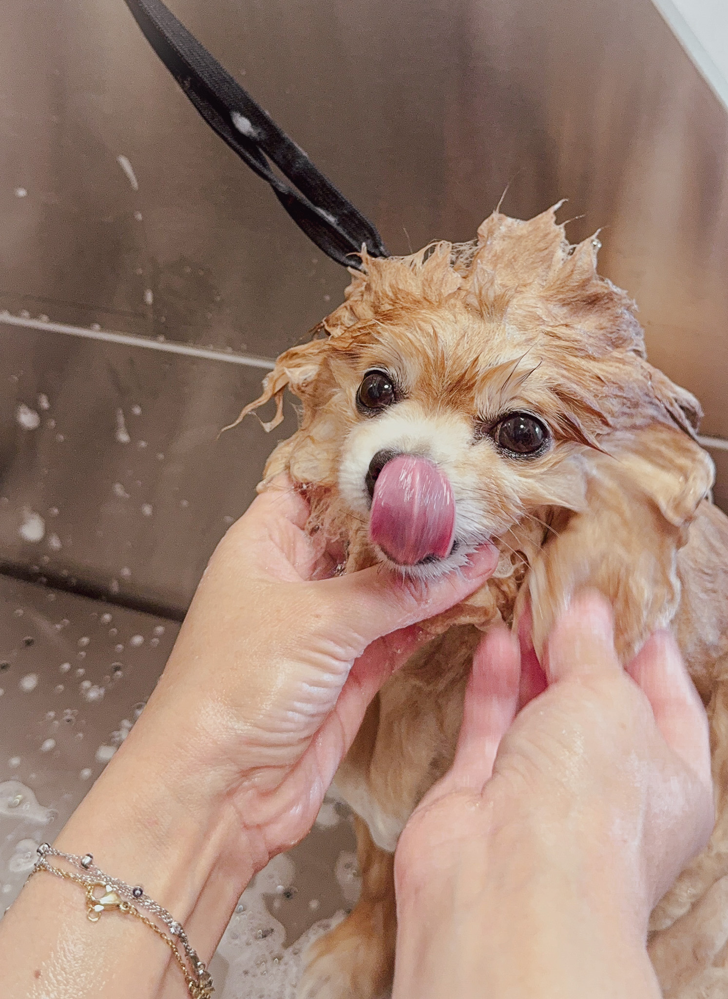 A tiny pup enjoying its bath time — gentle products, expert hands, and lots of love at Bark & Beauty.