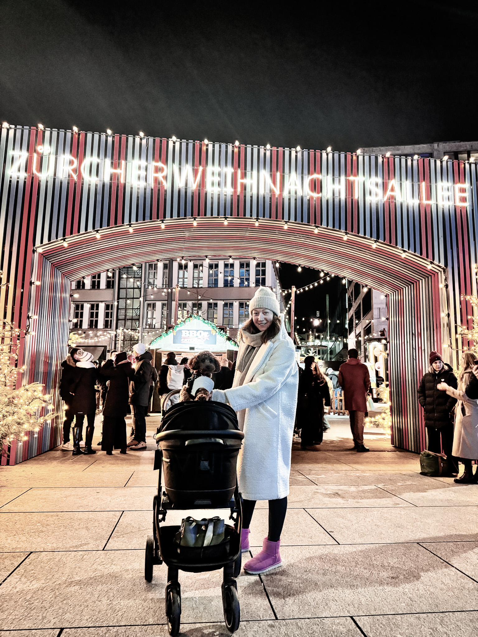 A heartwarming moment at the Weihnachtsallee Christmas Market, where visitors enjoy Zurich’s holiday magic with their dogs.