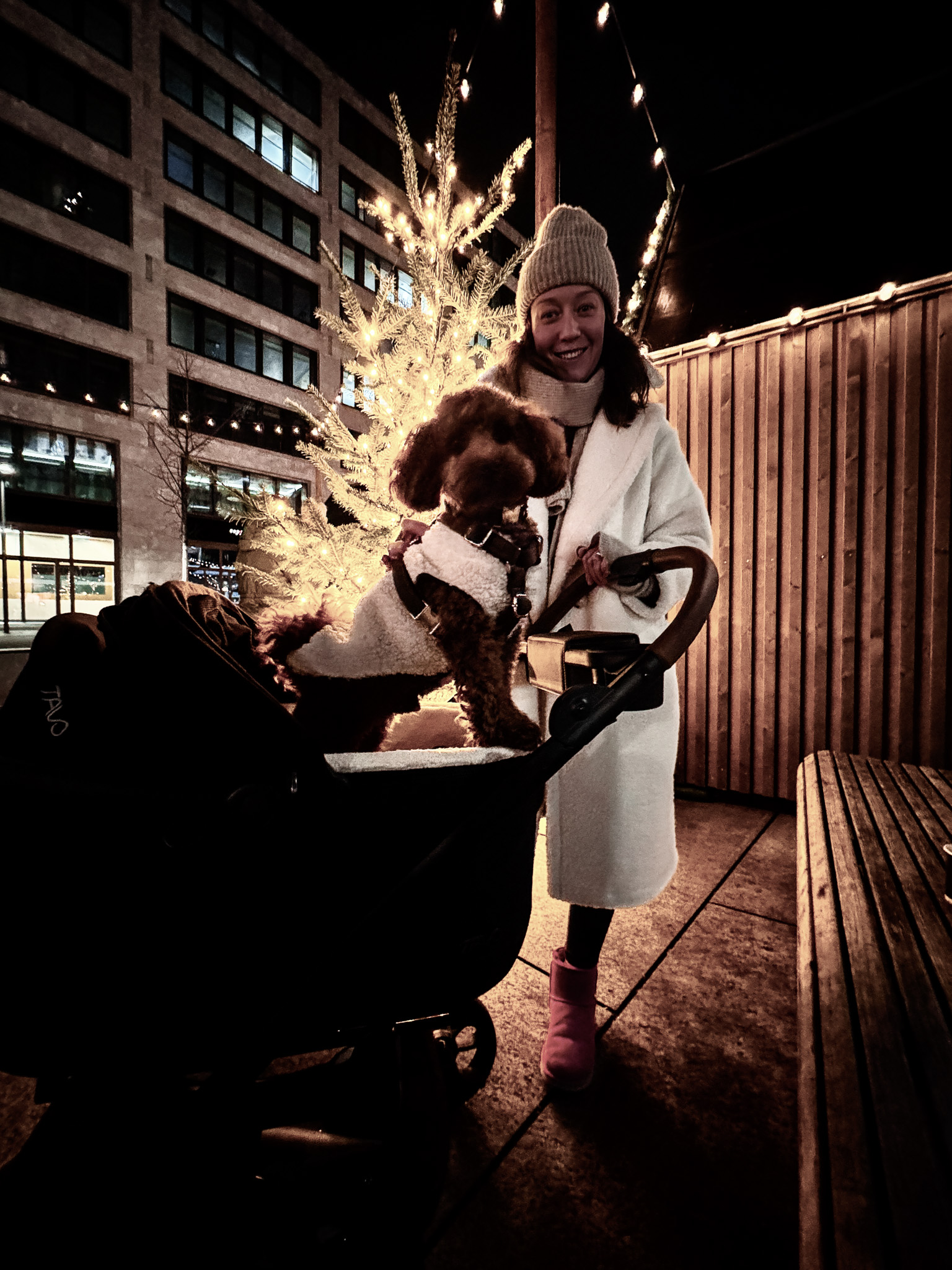 Under twinkling string lights, we enjoy a festive evening at Zurich’s Weihnachtsallee Market with our dog.