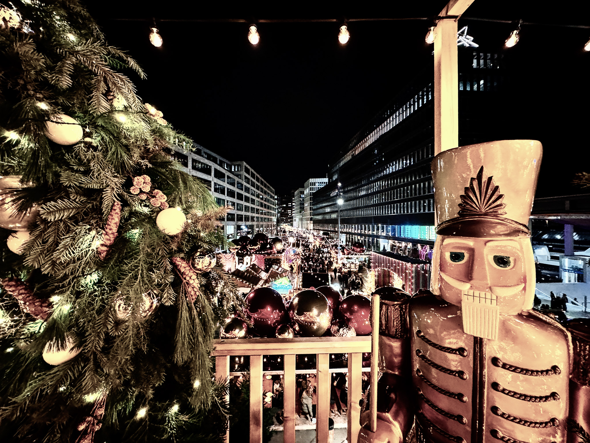 From the balcony above the market, a decorated tree and classic nutcracker frame the glowing view of Zurich’s Weihnachtsallee below. The scene perfectly blends tradition and modern city elegance during the holiday season.